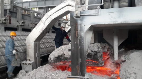 待多功能天車將殘極調(diào)出,趙德福高溫下的"高溫作業(yè)"才算正式開始。因?yàn)闅垬O調(diào)出后裸露出火紅的、溫度高達(dá)900多攝氏度的爐膛。趙德福用大勾、大耙等工具將大小不一的殘極塊一一撈出,確認(rèn)爐膛干凈后,指揮多功能天車裝入新陽極,張壽昌、劉強(qiáng)負(fù)責(zé)添加保溫料、殼面整形等。