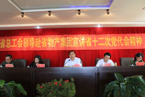 7月2日下午,省總工會巡視員、經費審查委員會主任劉西昆、經審辦蒲勤主任、女工部韓梅部長、重工機械輕紡工會白立賢副主席一行4人來物產集團宣講省十二次黨代會精神。集團黨委書記、工會主席白家林同志主持宣講報告會,集團兩級工會主席、委員40余人參加宣講報告會。